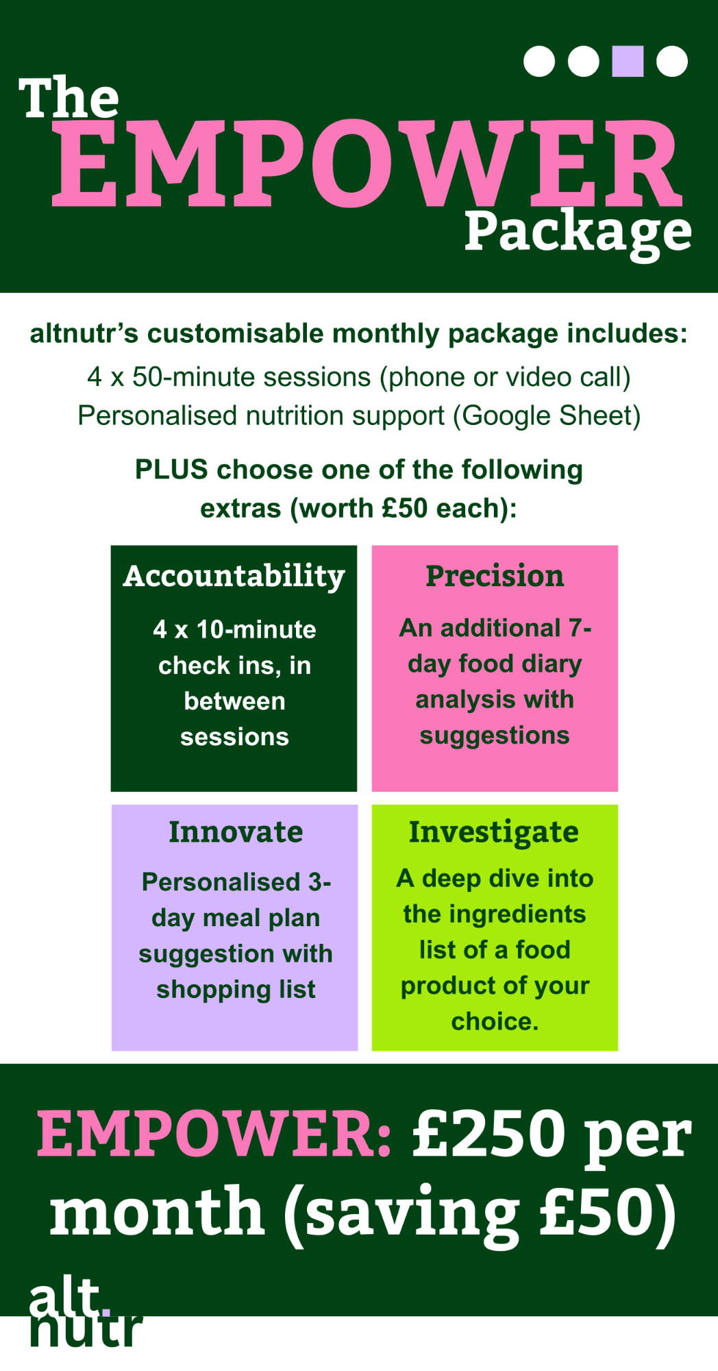 Prices start at £60 per 50-minute session, from as regularly as once per week. This includes our shared Google Sheet, containing all your personalised nutrition support that you’ll have 24-hour access to.